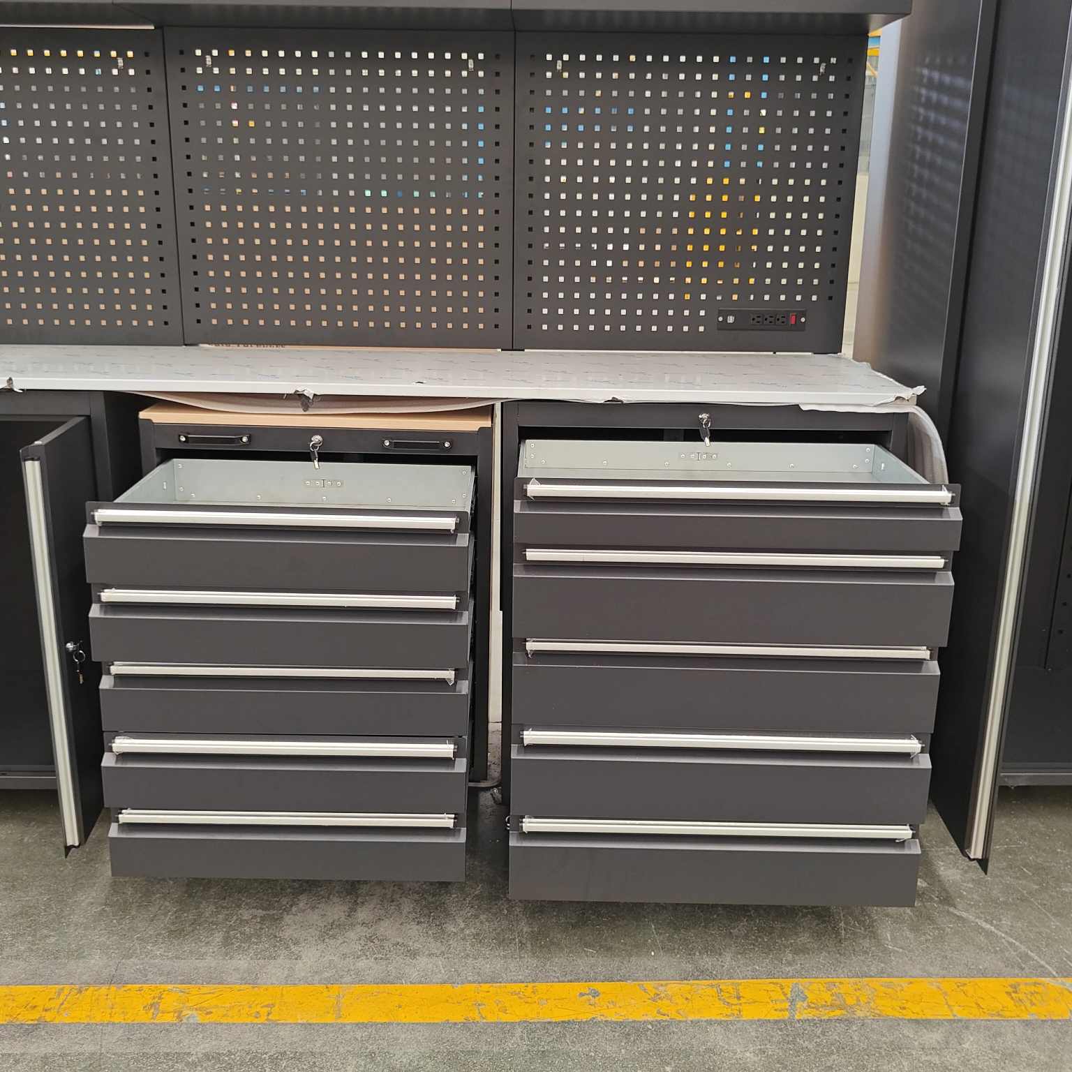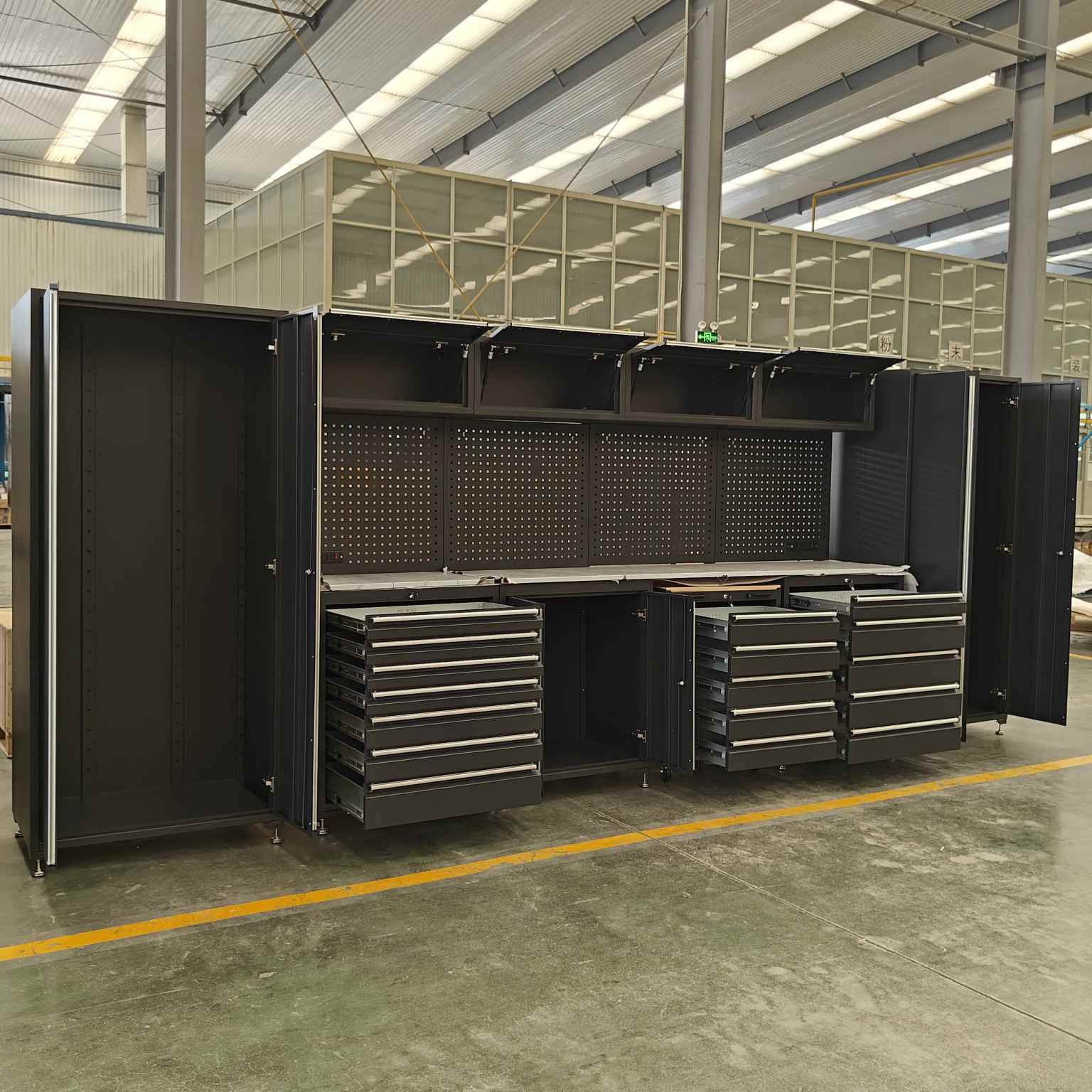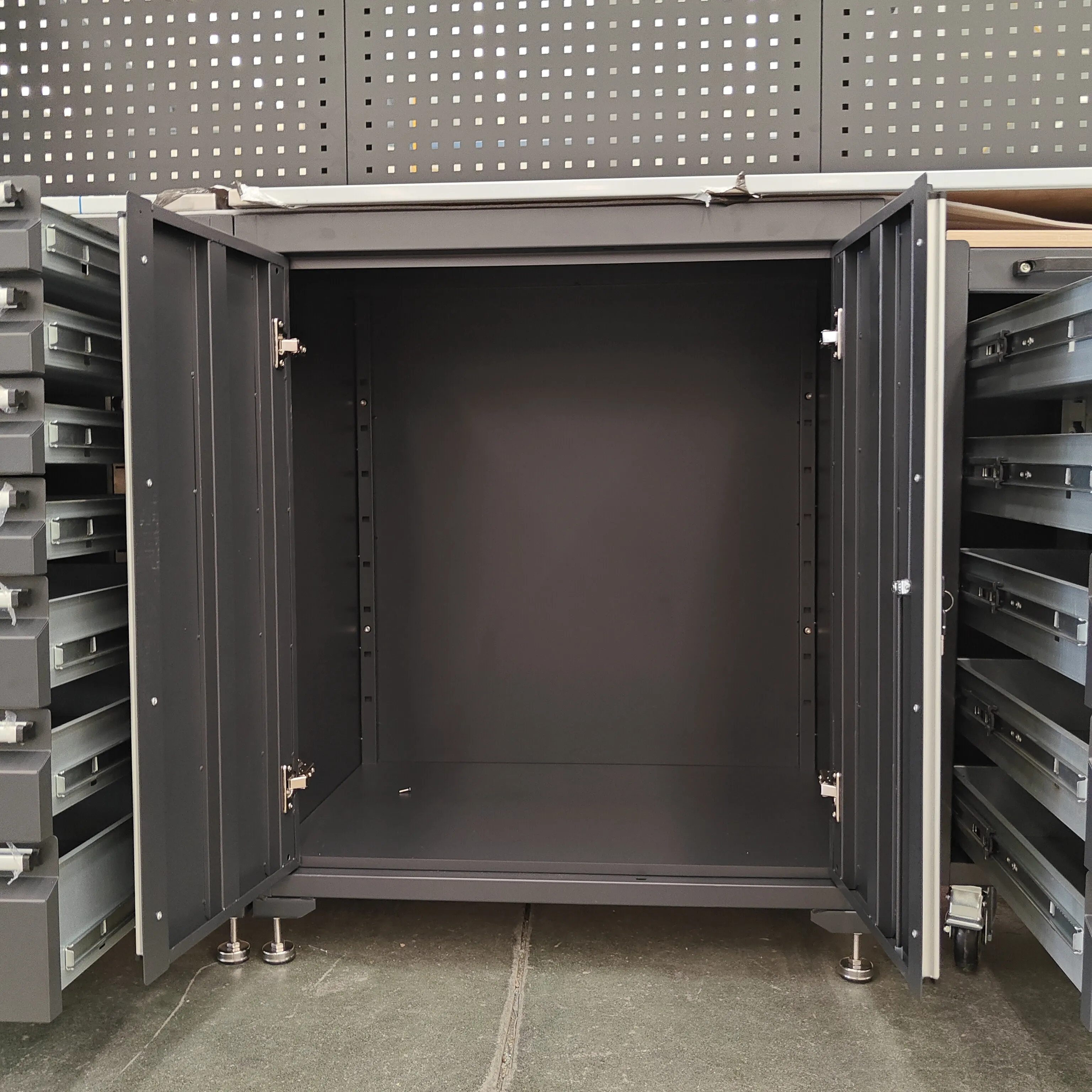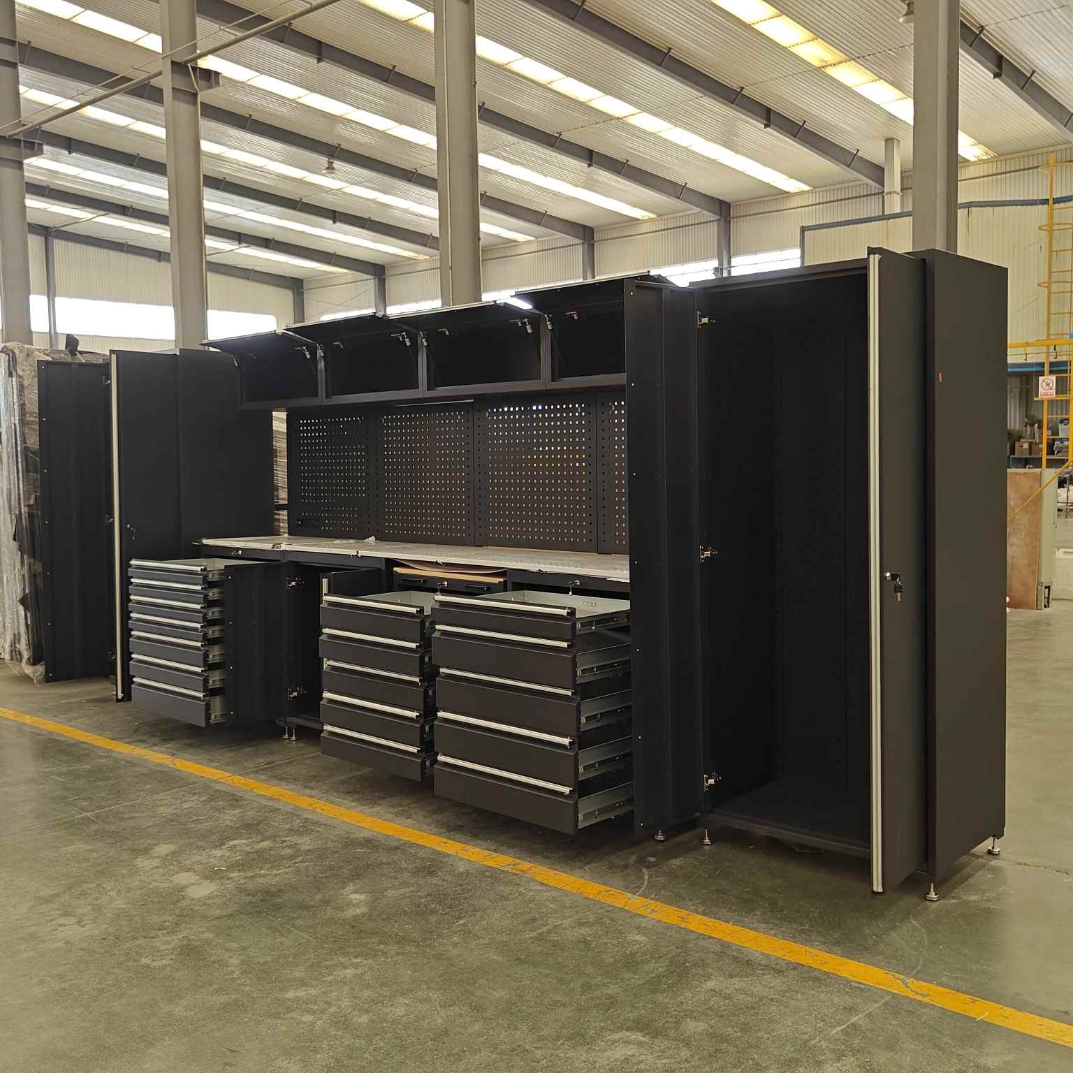 A nagy teherbírású szerszámszekrény több fiókkal rendelkezik, minden fiókhoz nyitott polc-kialakítással, amely alkalmas különféle méretű szerszámokhoz.
