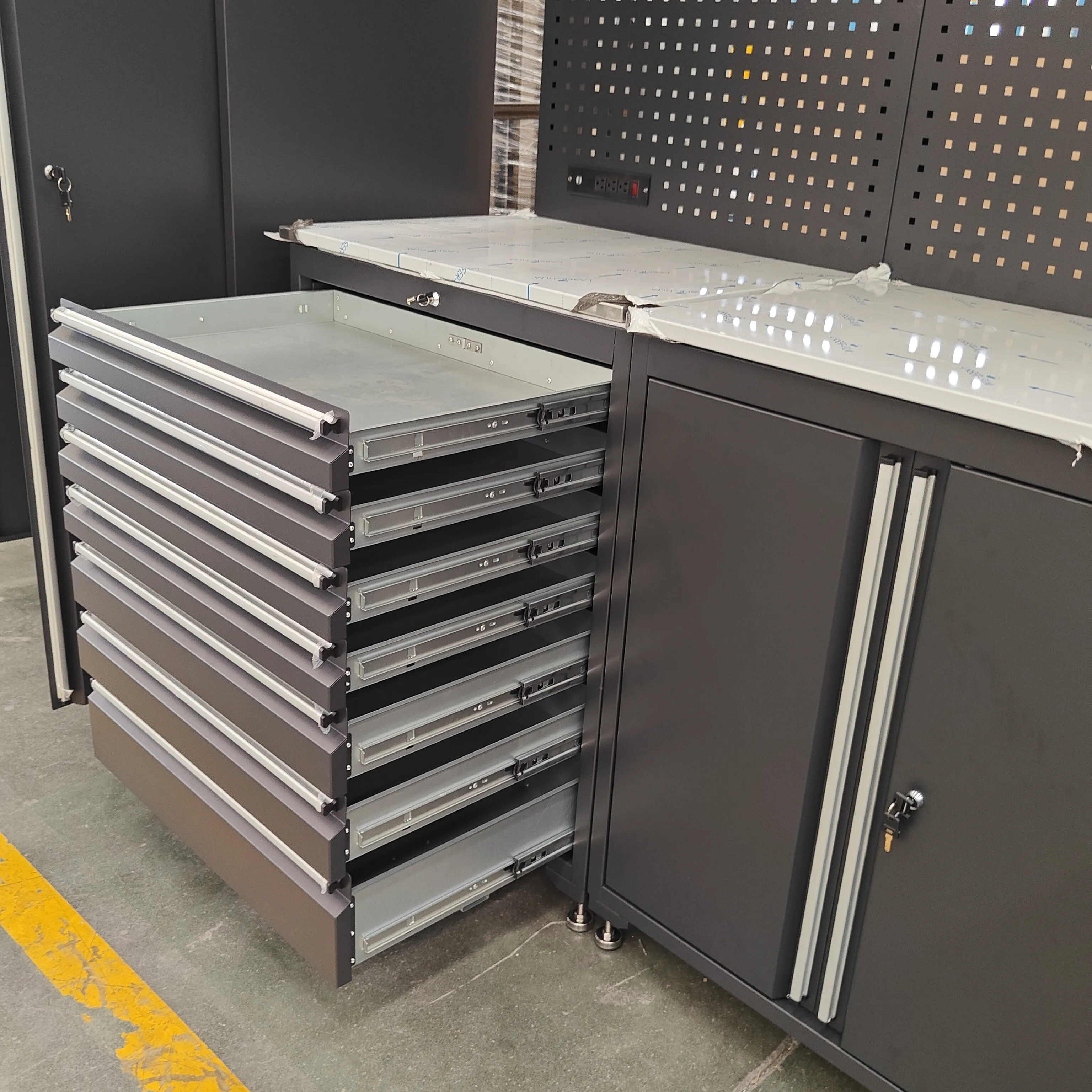 A nagy teherbírású szerszámszekrény fiókjai csendes csúszó sínekkel vannak felszerelve, biztosítva, hogy a fiókok kinyitása vagy bezárásakor ne zajt.