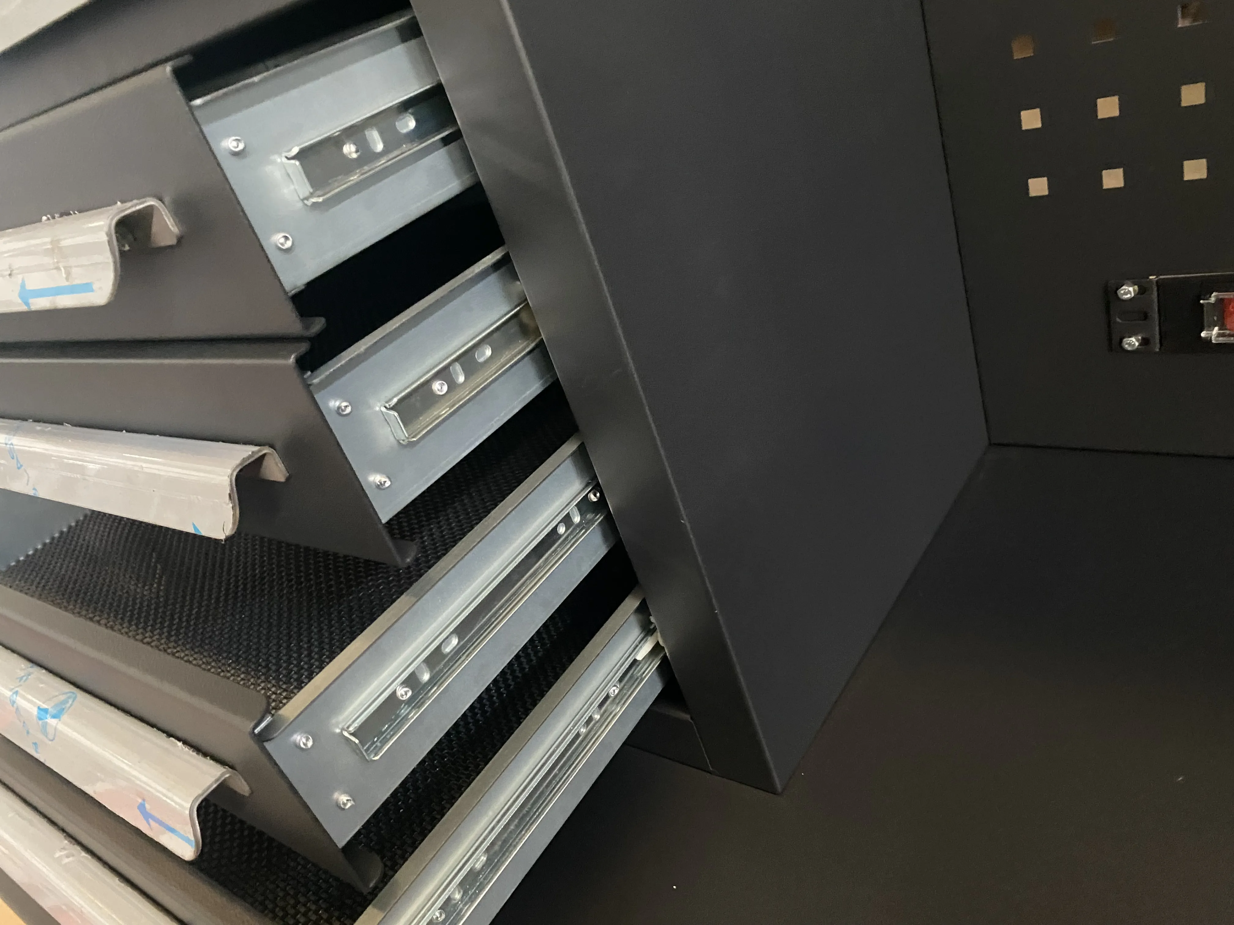 A szerszámszekrény 2550 milliméter hosszú. A vastagság, a szín, a méret és a fiókok testreszabhatók az ügyfelek igényeinek megfelelően. Mind a wrokbench, mind a fiókok hidegen hengerelt acélból készülnek. Két erőszalag van itt. A fiókok LED -es lámpákkal vannak felszerelve, a LED -es lámpák lóghatnak a hálópanelen, amely megkönnyíti a megvilágítást a munkapadon végzett munka során. A fiókokban vannak párnák, amelyek hatékonyan csökkenthetik a karcolást.