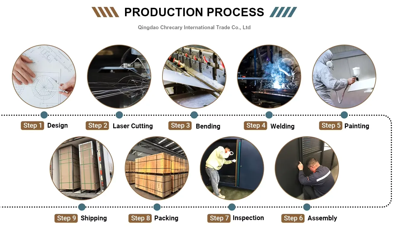 1. Nyersanyagok beszerzése: A kiváló minőségű, hidegen hengerelt acéllemezeket gondosan választják ki a fő anyagként annak biztosítása érdekében, hogy az anyag erőssége és keménysége megfeleljen a magas színvonalon. Ugyanakkor különféle kiváló minőségű kiegészítő anyagokat vásárolnak, például gömbcsapágylemezeket fiókokhoz, zárakhoz és görgőkhöz.