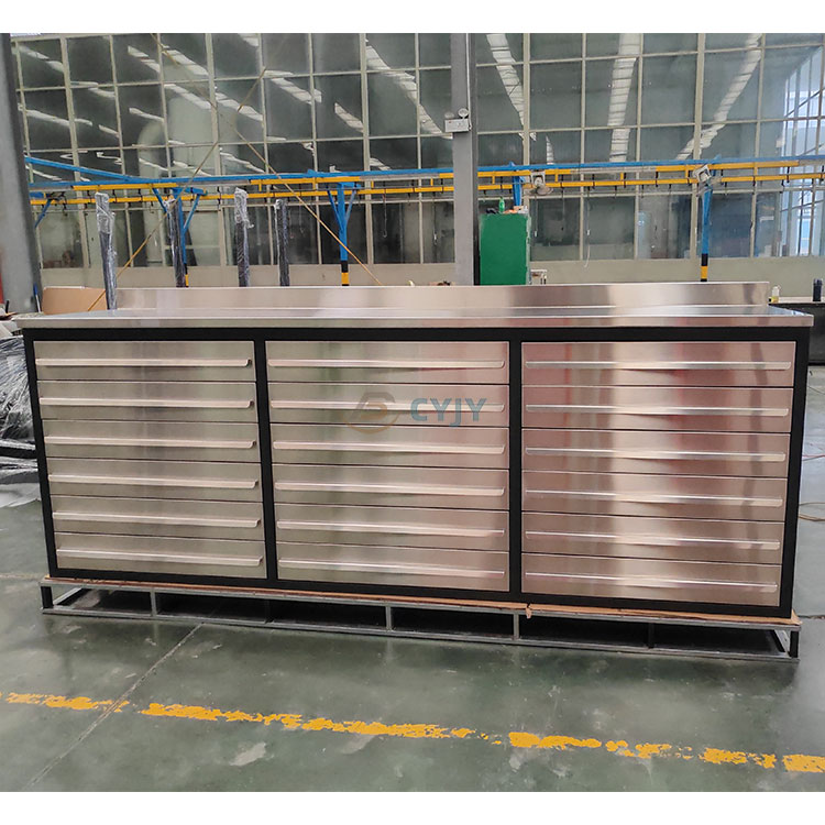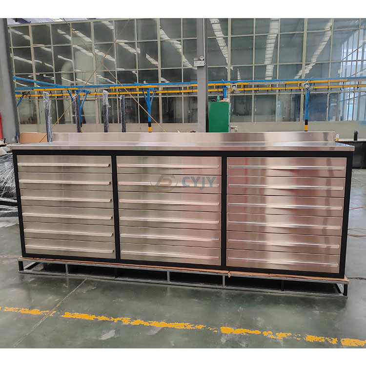A rozsdamentes acél szerszámok munkapadjai főként hidegen hengerelt acélból készülnek, amely nagyon erős, korrózióálló, sima és könnyen tisztítható. Több kis pultból áll össze, és több tárolóhelyen is használható, például garázsokban, irodákban és kávézókban. Minden kis szekrény önálló fiókkal rendelkezik, a fiókok pedig fiókpárnákkal vannak felszerelve, ami lehetővé teszi a tárgyak jobb tárolását. Munkapadjaink rozsdamentes acélból készülnek, így nem könnyű rozsdásodni és szebb a felület. A fiókok hidegen hengerelt acélból készülnek, és mindegyik fiókhoz tartozik egy tárcsa, ami kényelmesebbé teszi a dolgok kinyitását.